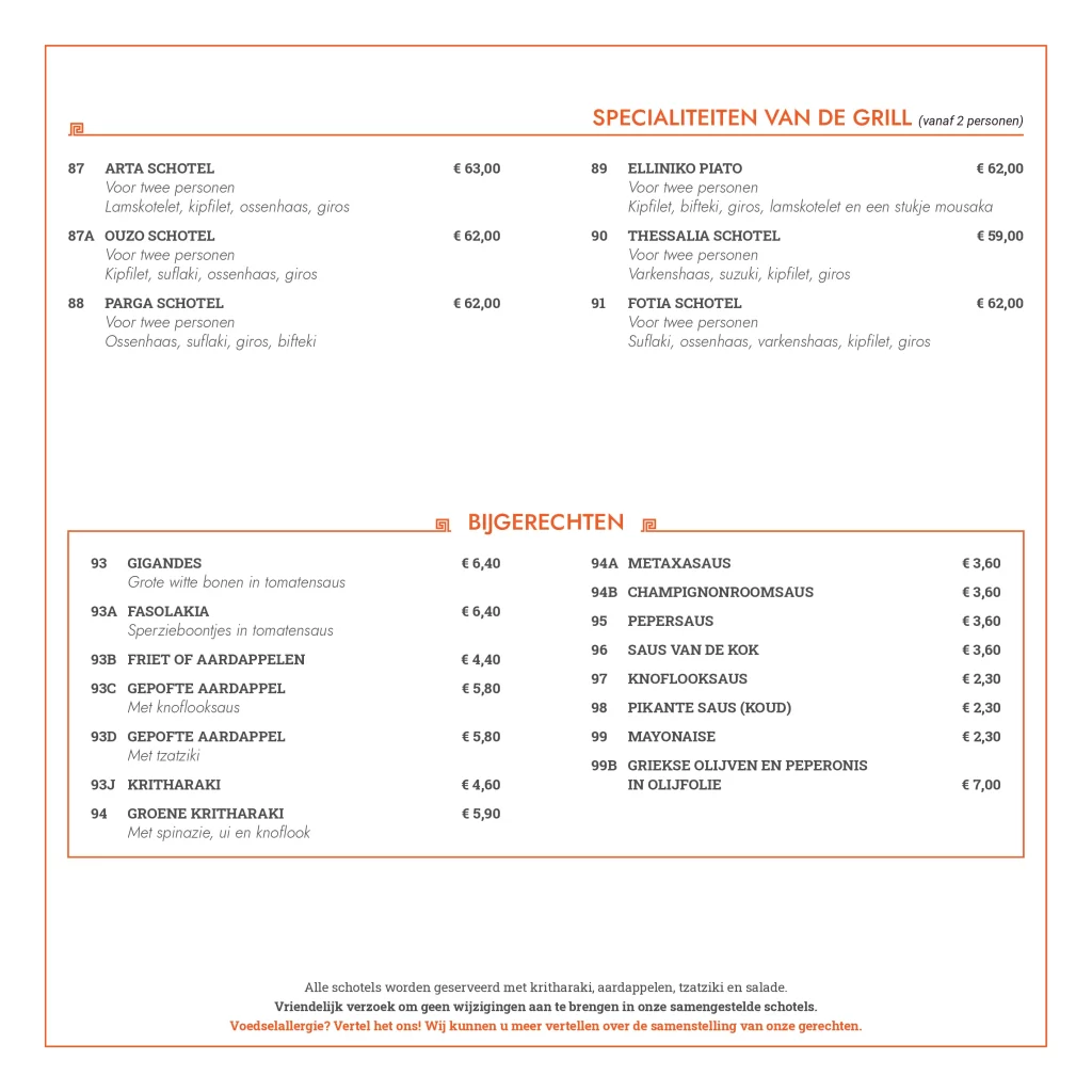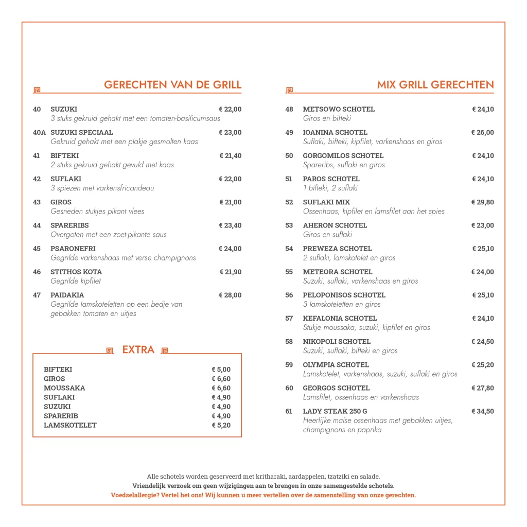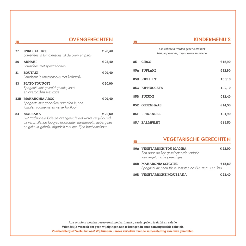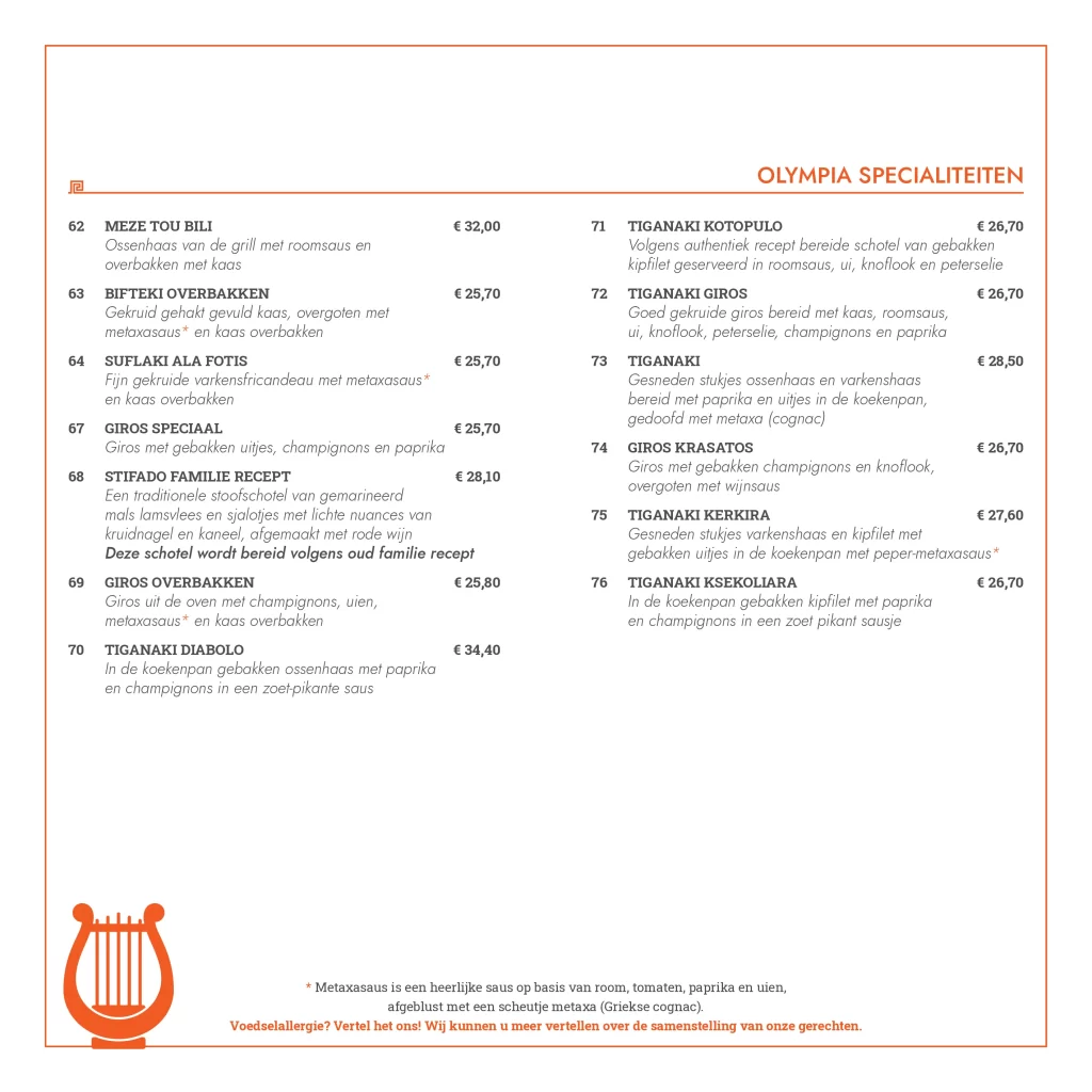 Kwaliteit, service en gastvrijheid. Deze ingrediënten staan centraal bij Grieks restaurant Olympia. Wij verzorgen al sinds 2006 de meest smakelijke Griekse gerechten. Versheid van onze producten staat op nummer één, deze kwaliteit komt absoluut tot uiting in de heerlijke gerechten die de keukenbrigade van Olympia serveert. Onze kaart is Grieks georiënteerd, maar bevat voor ieder wat wils. Zowel vlees, vis als vegetarische producten, alles wordt door ons zelf bereidt en dat proef je absoluut!